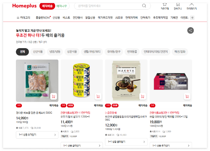 - 1+1 혜택: 훈제오리, 두부, 요구르트 등 냉장식품 중심 구성