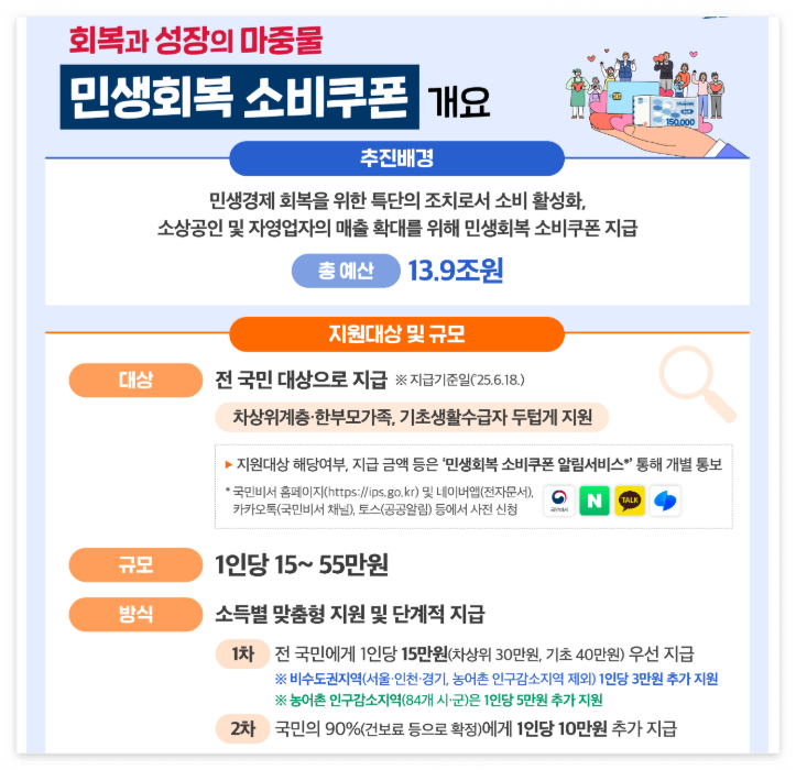 2025년 7월 21일부터 본격적으로 신청이 시작된 민생회복 소비쿠폰. 단순히 쓰는 것만으로는 절반도 못 누리는 이 혜택, 신용카드사와 간편 결제(핀테크)를 제대로 활용해야 알짜 혜택을 모두 챙