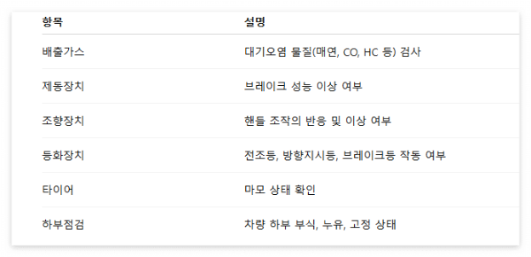 자동차 종합 검사에서는 차량의 주요 장치와 환경 영향을 점검합니다. 검사 항목은 다음과 같습니다.