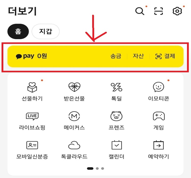 2) 카카오톡 실행 → 오른쪽 아래 ‘… 더보기’ → 카카오페이 선택 → 약관 동의 → 휴대폰 본인 인증 이 과정까지만 완료하면 기본 가입은 끝